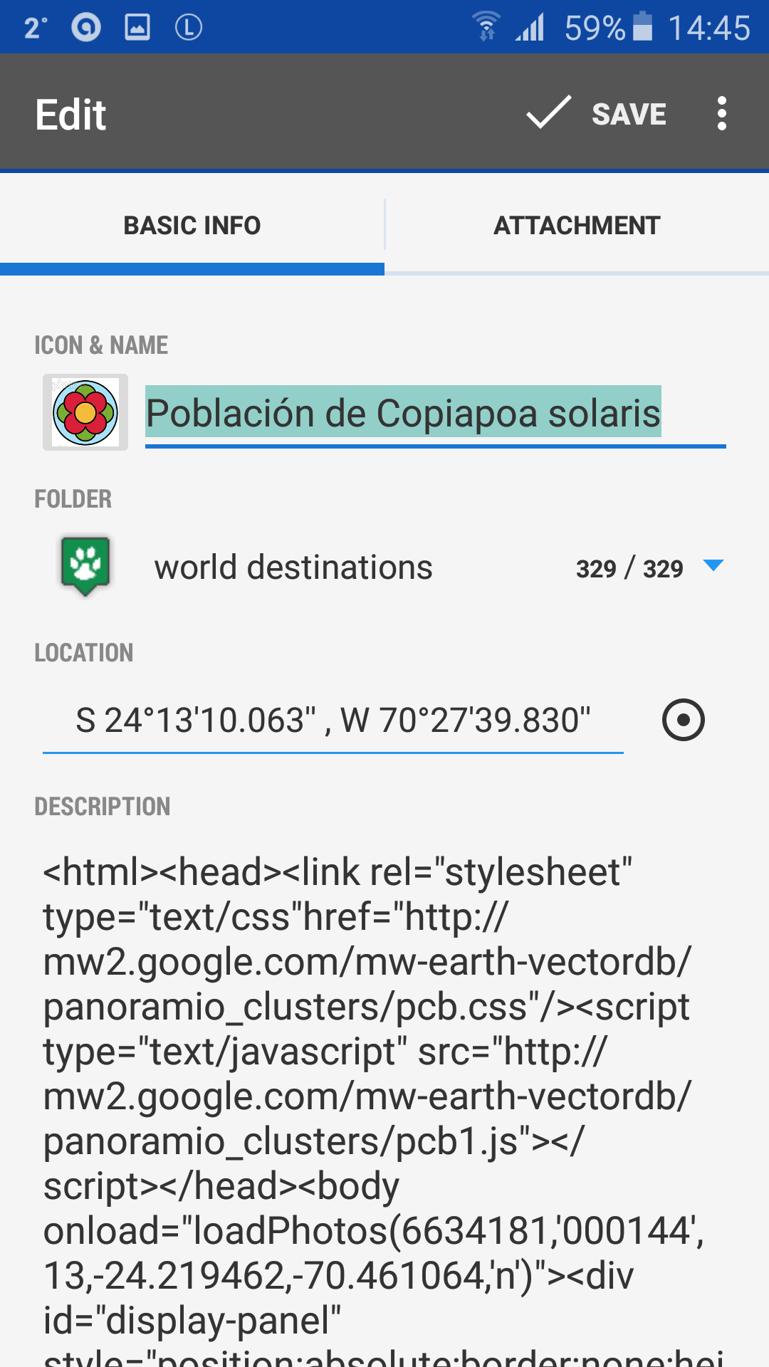 I did sent the .kmz file with the screen shots. Here it is again. The script is the exactly the same as in the .kmz file. The way to create the .kmz file with the link to Panoramio on Google Earth is to open Google Earth, enable images in the left panel, right click on an image icon and choose "Save to my places". This creates new file under "Temporary Places" on the left panel called Places. Then right click on this new file and choose "Save Place As..." and select destination folder. This file will have the same .kmz script that you can see on my screen shots. This is therefore the same link (pointer) to the image in Panoramio data base and Google Earth will display the image. I created many points like this in one .kmz file and then imported this file into Locus points. It worked well under Android Katkit 4.4.3, but does not under the new 5.1.1. May be it is necessary that Locus Maps declare SD card storage place, which is a new thing under Lollipop.