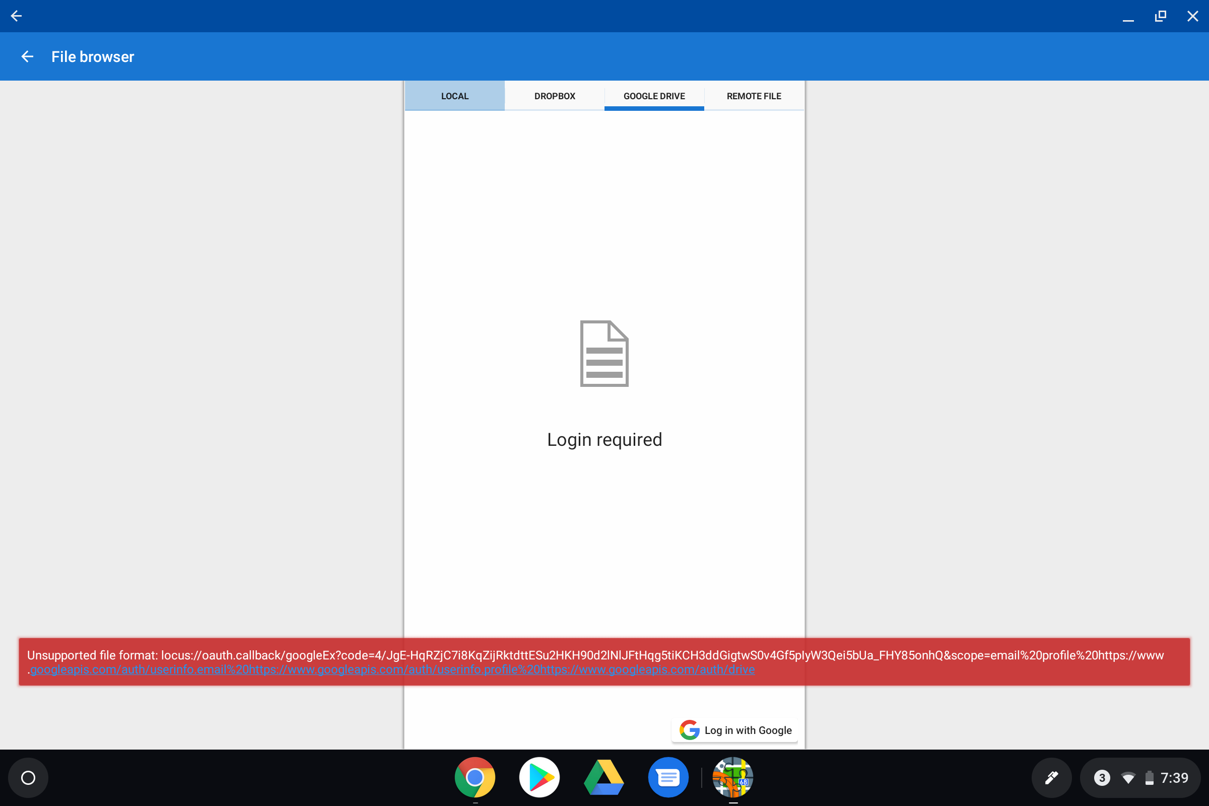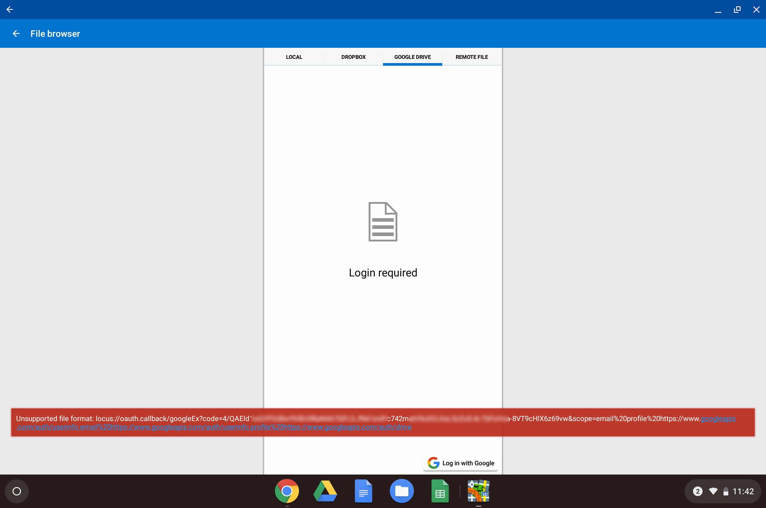I've just started using Locus (Pro) on my Chromebook Pixel and it seems to work fine except when trying to gain authorisation for my Google Drive. I get the error "Unsupported file format..." as shown in the screenshot.