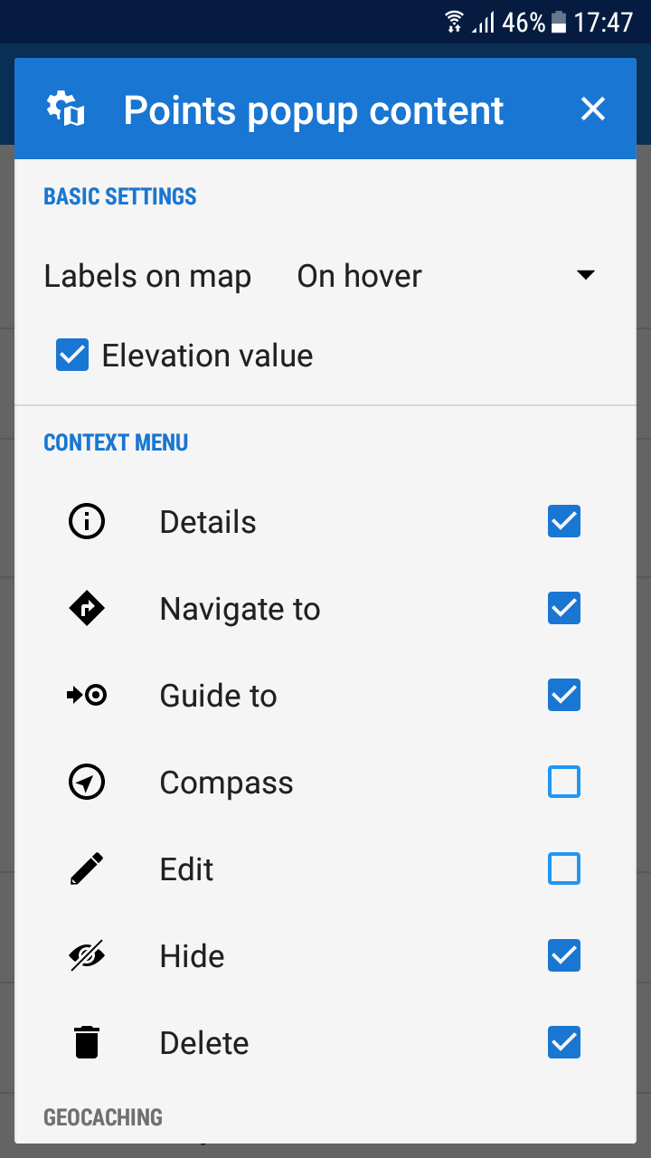 "Settings - Maps - Points & Tracks - Points Popup (or Track Popup)".