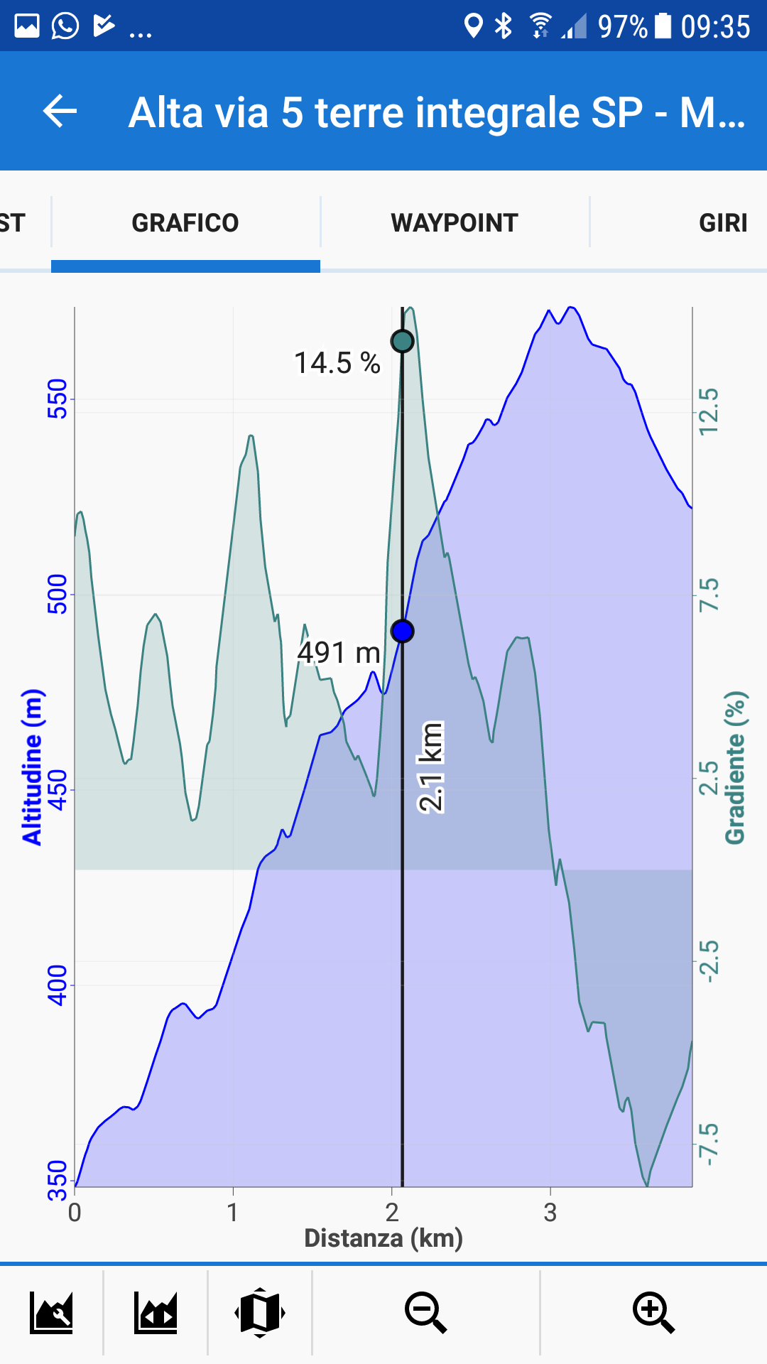 If you would be a demigod, you would make it possible to easily select any two waypoints for statistical data display: when selecting on the graph, the selection lines would cling/jump to waypoints. However, with dragging it would be possible to select ANY two ordinary trackpoints on the track – not just waypoints.
