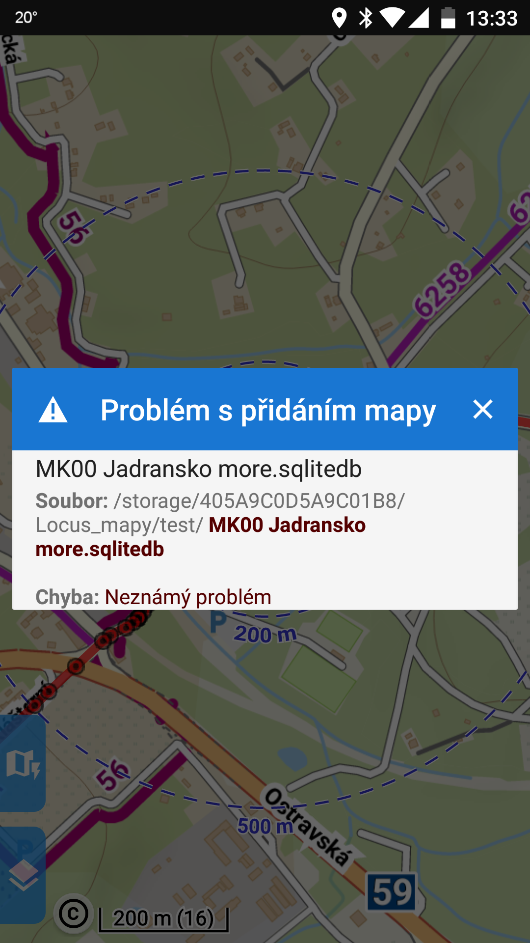 I following these steps:Maps > Offline > External maps > I choose file or dir with those problematic maps. Then it says in green text "process successful", but map is NOT added to Offline maps. When I hit + button and go again to External map, I can see that file or dir. After restart Locus, during initializing, there is error message with that error - see attached file (it says "problem with adding the map", Error: unkown problem".