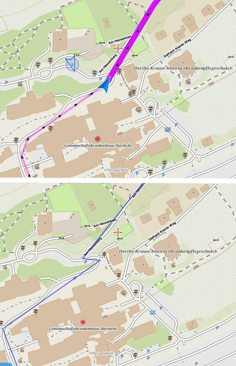 As for the latter the navigation may not follow the track, in contrary to guidance. In such a case, or if not using OSM map, or if OSM map or routing data are old, results may be strange.