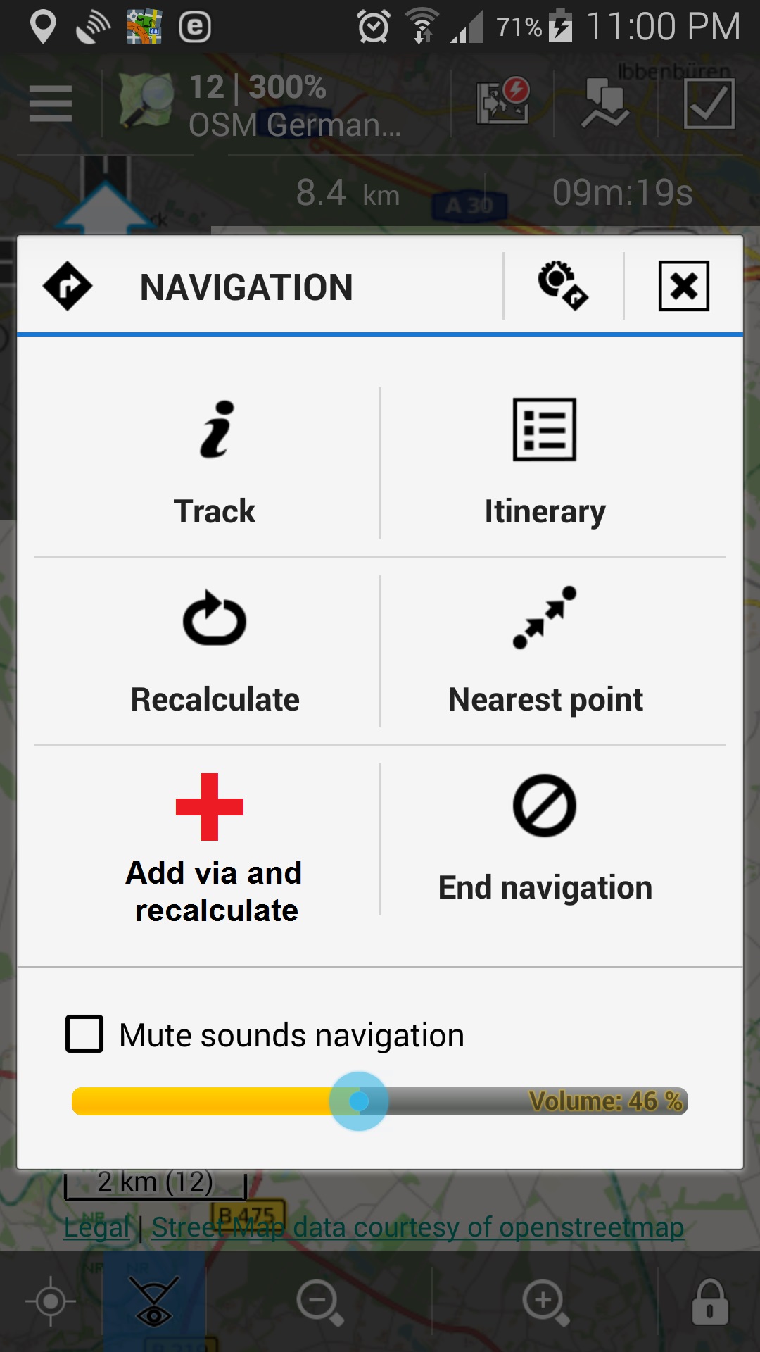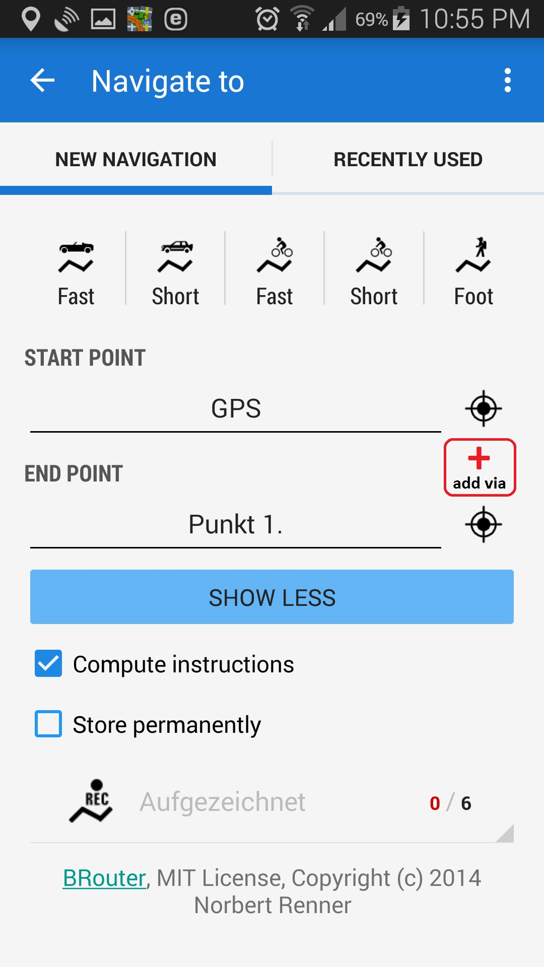 The navigation function including the instant recalculation is great, but I would like to see a simple option to add via points between the start and destination of the route (travelling from A over B to C). A function as it is usually available in car navigation systems, for instance.