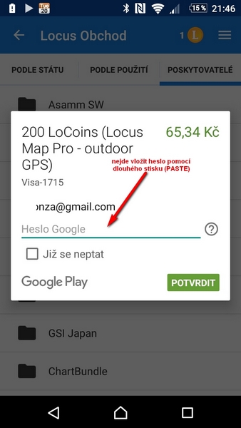 při nákupu Locoins nejde vložit heslo z paměti. Heslo si dám do paměti z aplikace na hesla, pak jdu do Locusu, v políčku HesloGoogle se pokusím o PASTE - tedy dlouze stisknu, ozve se hmatová odezva, ukáže se kurzor takže heslo jde vložit ručně, ale neukáže se tlačítko "Vložit" tak jako v obchoděPlay nebo v jiných aplikacích při použití běžného vložení informace z paměti. Nevím jestli se tato chyba objevila po update androidu nebo po update Locusu. Mám Sony Xperia Z3 compact a Android 6.0.1. přikládám screenshot.