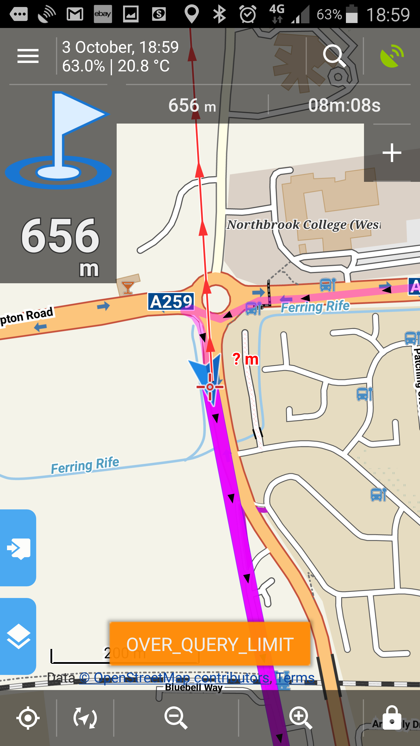 Over Query Limit - this kept coming up even though on commencing my navigation I made sure I was using Brouter as the source.
