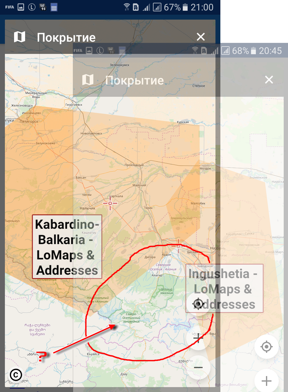 In the lomaps skipped the area that is between Ingushetia and Kabardino-Balkaria. For example, the Tseysky Reserve and everything to the south.