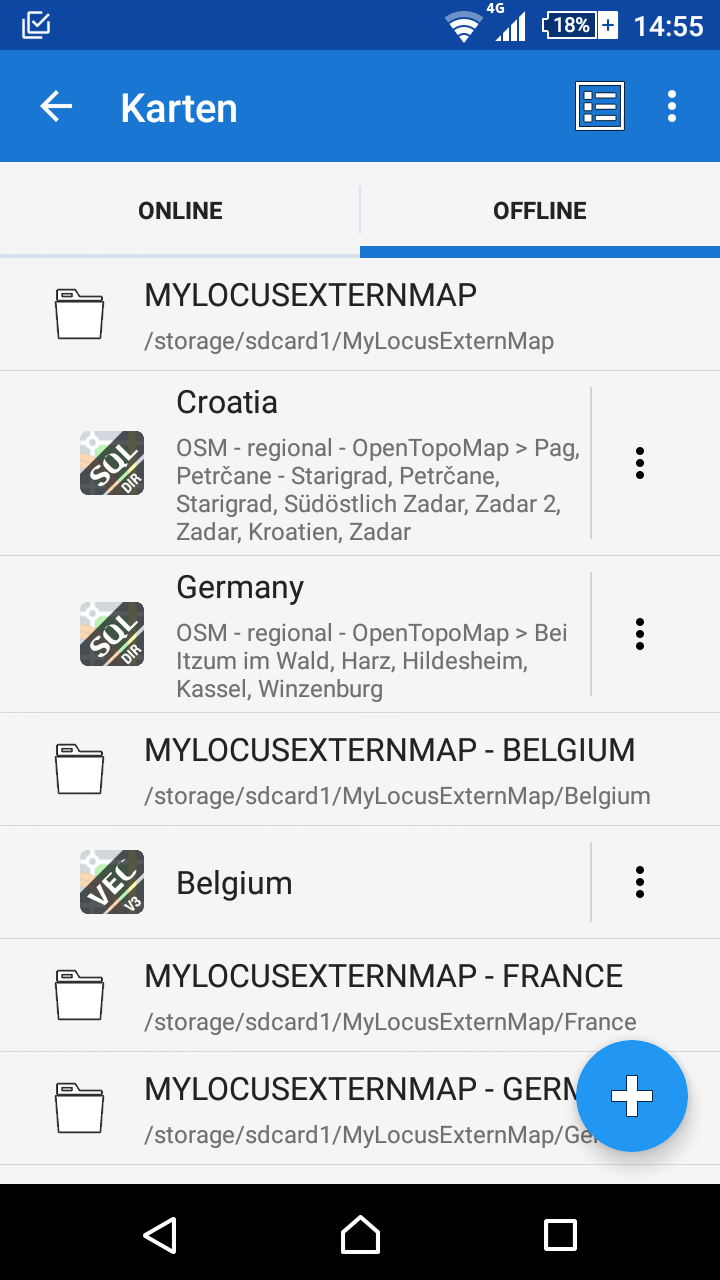First: I followed the instructions for moving map files to external SD card successfully as described here as solution "C.". I did it for the vector maps (Locus/MapsVector) and for the personal sqlitedb maps which I downloaded for offline use. I wondered that after that change all sqlitedb maps appears merged by country since these are located at MyLocusExternMap/Maps on external SC card. When I put them back into the Locus/Maps directory on the internal storage the maps are listed individually (which I would prefer...). What's the reason for this difference and is there any way to show the personal sqlitedb files listed individually when loaded from external SD card? Find attached a screenshot of the merged view for sqlitedb maps for "Croatia" and "Germany". Thanks!