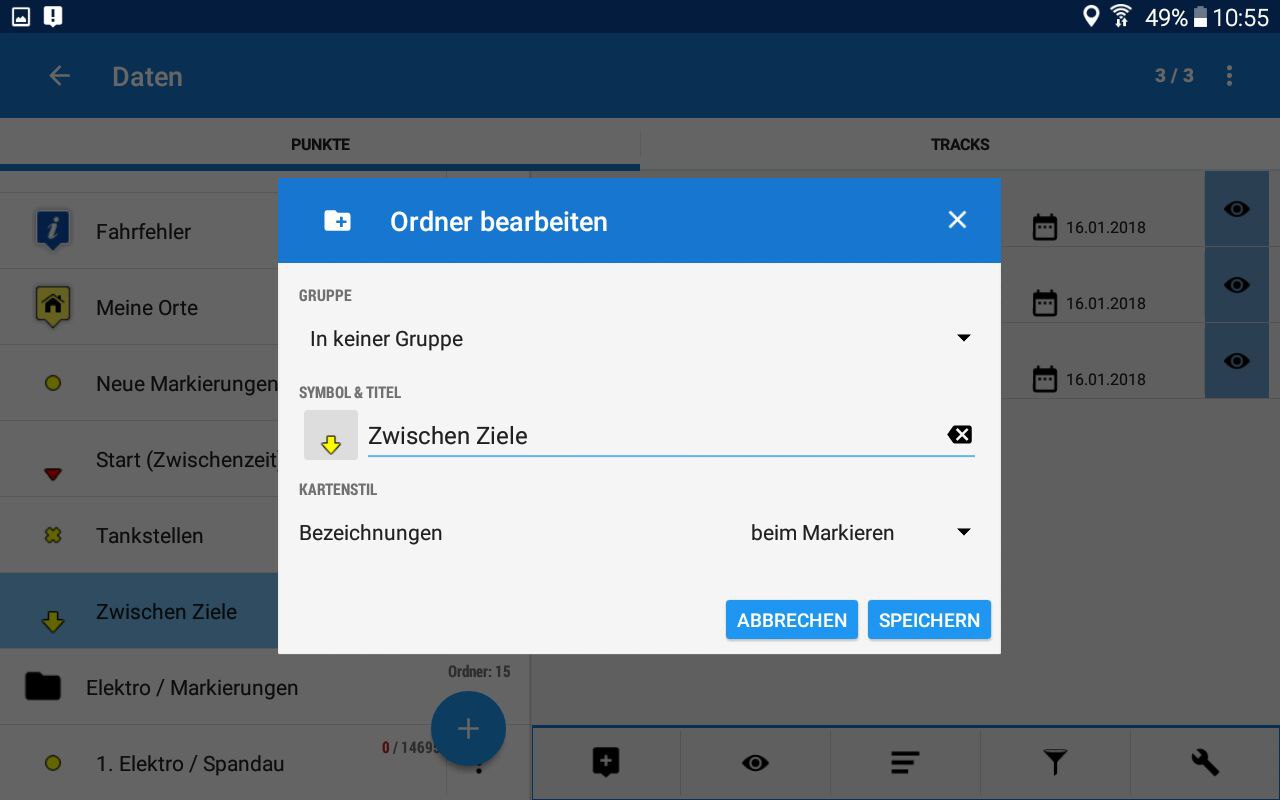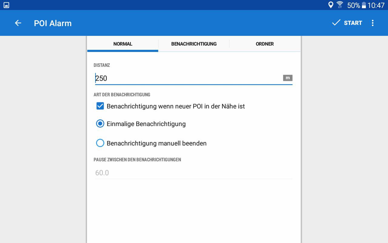 DEGuten Tag Entschuldigung für die verspätete Rückmeldung. Bei einer Einstellung von 250 meter und einer Einmaligen Meldung wie im Bild zu erkennen werden die 3 Markierung vom poi Alarm zwar erkannt und durch eine gelbe linie angezeigt aber die eigentliche Beschreibung der Punkte jedoch nicht mehr angezeigt. Der Ordner der 3 Markierungen ist auf "Bei Markierung" eingestellt siehe Screenshots