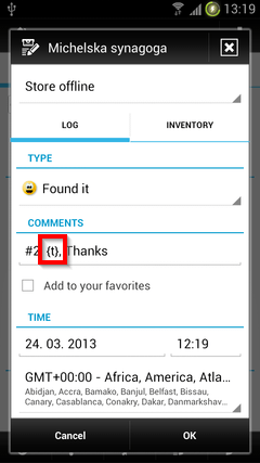 I`m asking before when you tap on "log button", and locus show you prefilled text, {t} remain as is. I only know number of found caches, so I change {c} for a valid number. But time is known after you set it in this dialog, so even after you click ok, Locus fill correct time as {t} value.