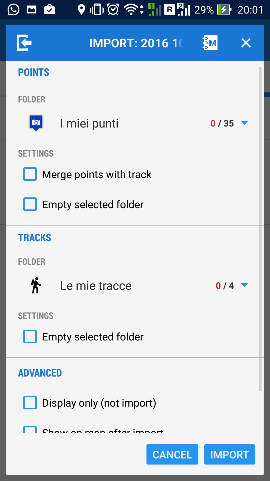 So I first try to import the track by opening the menu on the left, select track, tap on the 3 points on the right corner, select import, select the gpx file and import it.