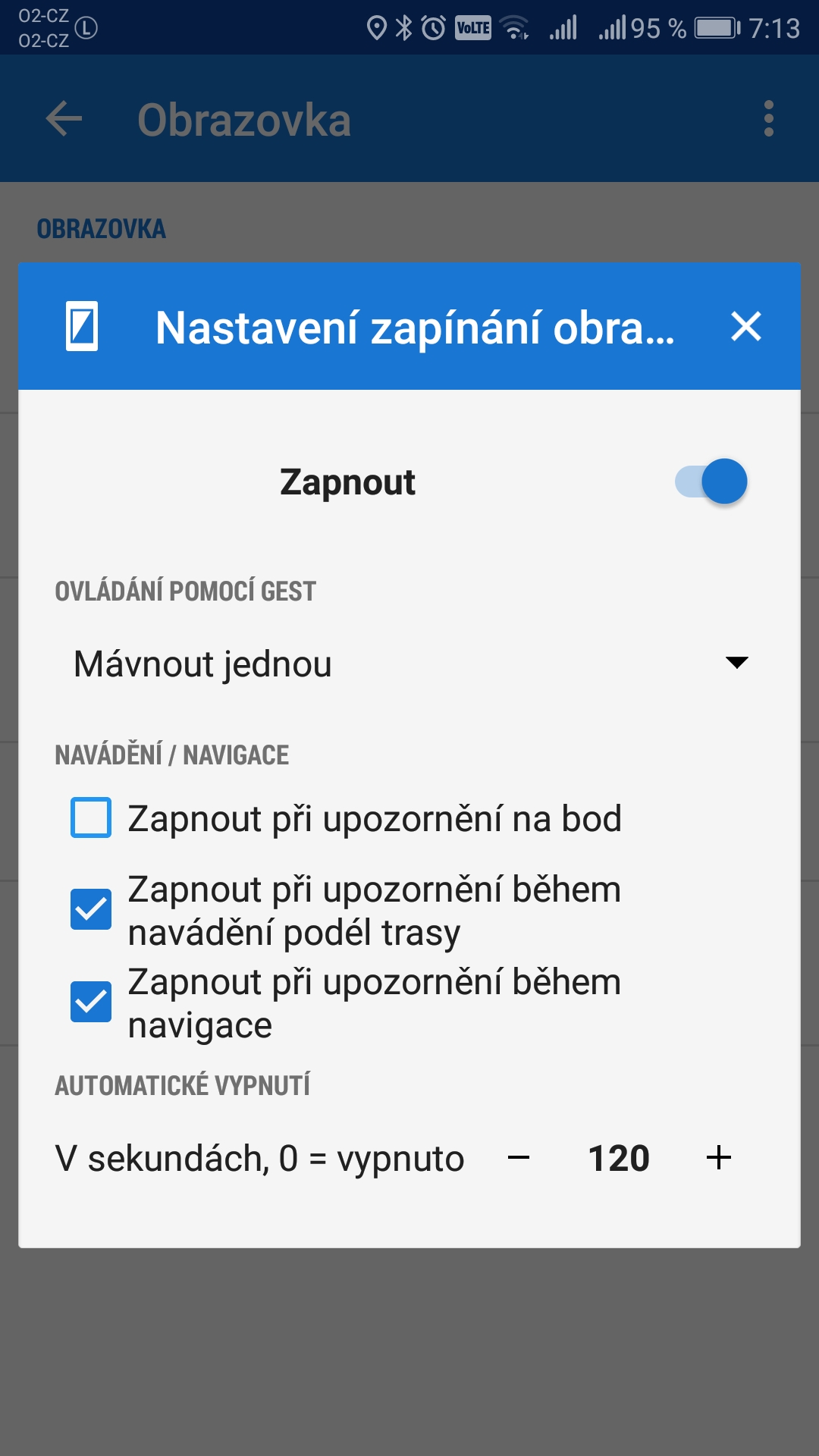 Ano to jsem zkusil a to funguje. Pokud to zapnu, obrazovka do režimu spánku nepřejde a je stále rozsvícená. Z toho usuzuji, že systémová oprávnění pro Locus v Androidu mám nastavená správně, protože Locus dokáže při tomto nastavení zabránit Androidu do přechodu na režim spánku. Ale já to nechci mít zapnuté pořád, to bych si zbytečně vybíjel baterii mobilu. Proto mám to stálé podsvícení vypnuto a mám nastaveno nastavení a vypínání obrazovky v té předchozí volbě tak, aby se displej rozsvítil při upozornění během navádění a při upozornění během navigace. A dále aby po 120 s zhasnul. Viz obrázek, ofotil jsem nastavení. Rozsvícení displeje funguje OK, jak má, pomohlo jak jsi mi včera poradil. Ale to zhasínání nefunguje. Neřídí se to nastavením v Locusu (120 s), ale telefon přejde do režimu spánku tak, jak mám nastaveno v Androidu (30 s). Což je moc rychle, několikrát mi to zhaslo třeba než jsem stačil projet kruháč nebo odbočku. A tohle jsem nevyřešil, podle mne musí být v tomhle v Locusu chyba. Provizorním řešením je samozřejmě před jízdou nastavit v Androidu ten režim spánku taky až na 120s a po jízdě to zase vrátit zpátky. Ale je to otrava.
