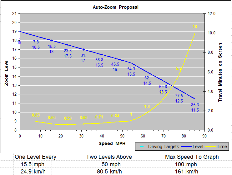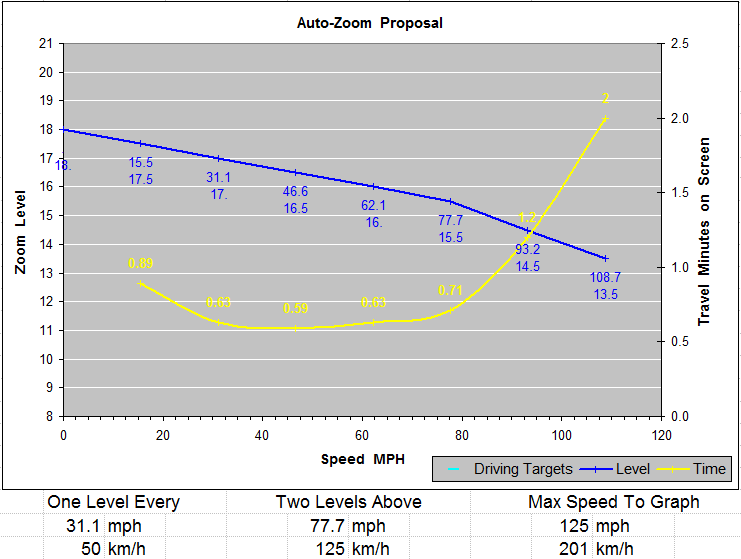 First, I propose that Auto-Zoom should not use preset zoom levels at all. Instead, it should zoom in or out relative to the last user-selected zoom level. For example, if I am stopped and select zoom level 17, then when I start moving Auto-Zoom would zoom out from level 17. If I am driving at 50 mph (80 km/h) and select zoom level 11, then slowing down would zoom in from level 11, and speeding back up to 50 mph would zoom back out to level 11.