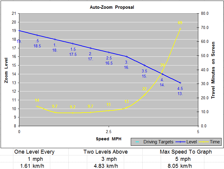 • At speeds near the "One level every" setting, speeding up can actually decrease the travel time on the screen as the distance increases. The effect looks smaller than what you would get with Auto-Zoom off -- around 30 seconds for driving speeds and one minute for walking speeds -- so I don't think it's a significant problem.