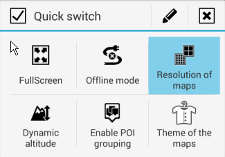 When you click on Quick switch in right panel Locus show you grid window where you can easily enable or disable Resolution of map