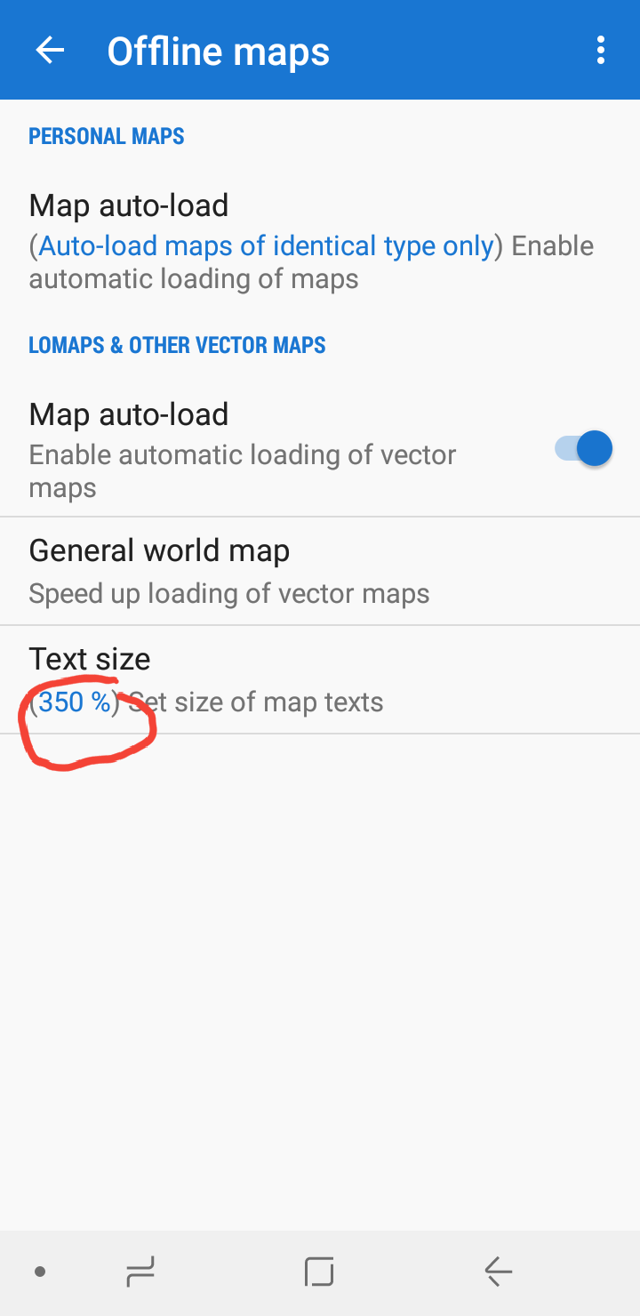 Settings> Maps> Offline maps> Text size, track overview, has an effect on the text on the map.