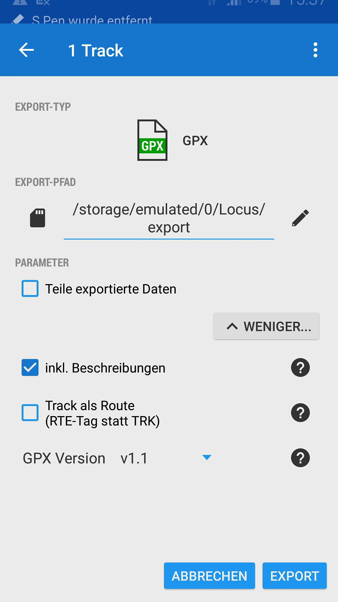 Ich exportiere den track in den dateimanager und dann via Bluetooth auf das andere Handy.