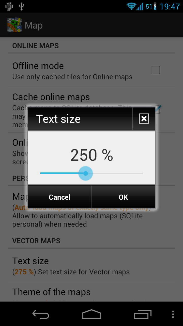i am using the Galaxy Nexus which has a 1280×720 px at 316 ppi resolution and measures 4.65 in (118 mm) diagonal. Thank you for implementing the text size in the vector maps.