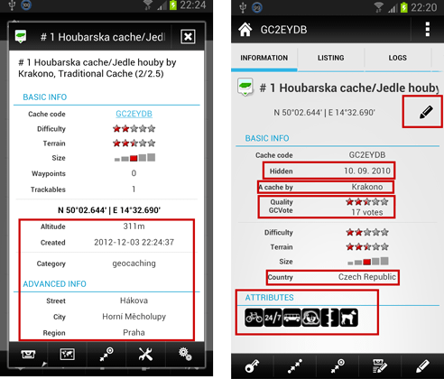 I have a suggestion regarding Geocaching. When I click to a cache on the map, a small widow with basic info appears. What about adding attributes to this window and delete the first bookmark with extended basic info after click to a "cache" button, so it would open the listing instaead?
