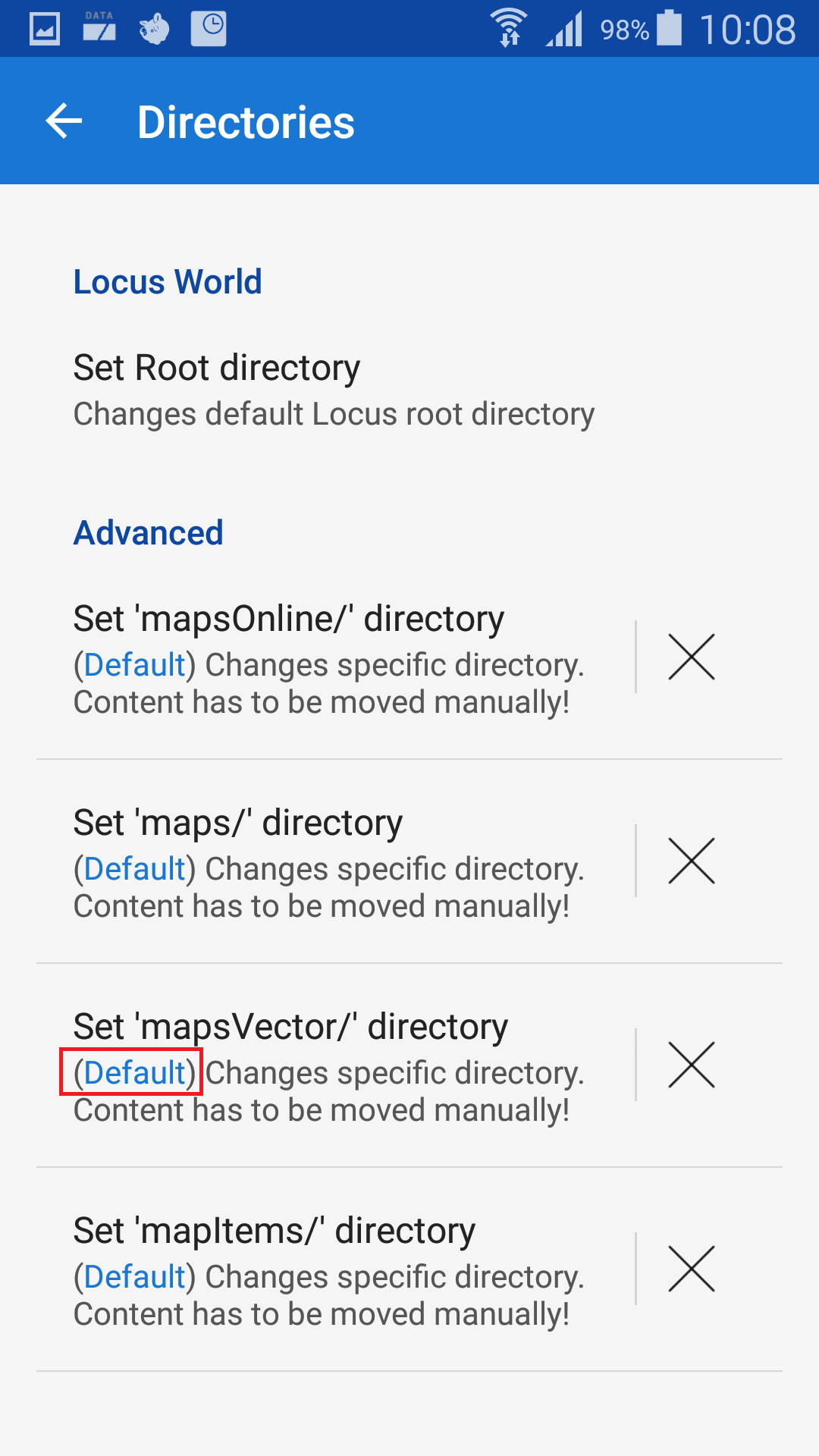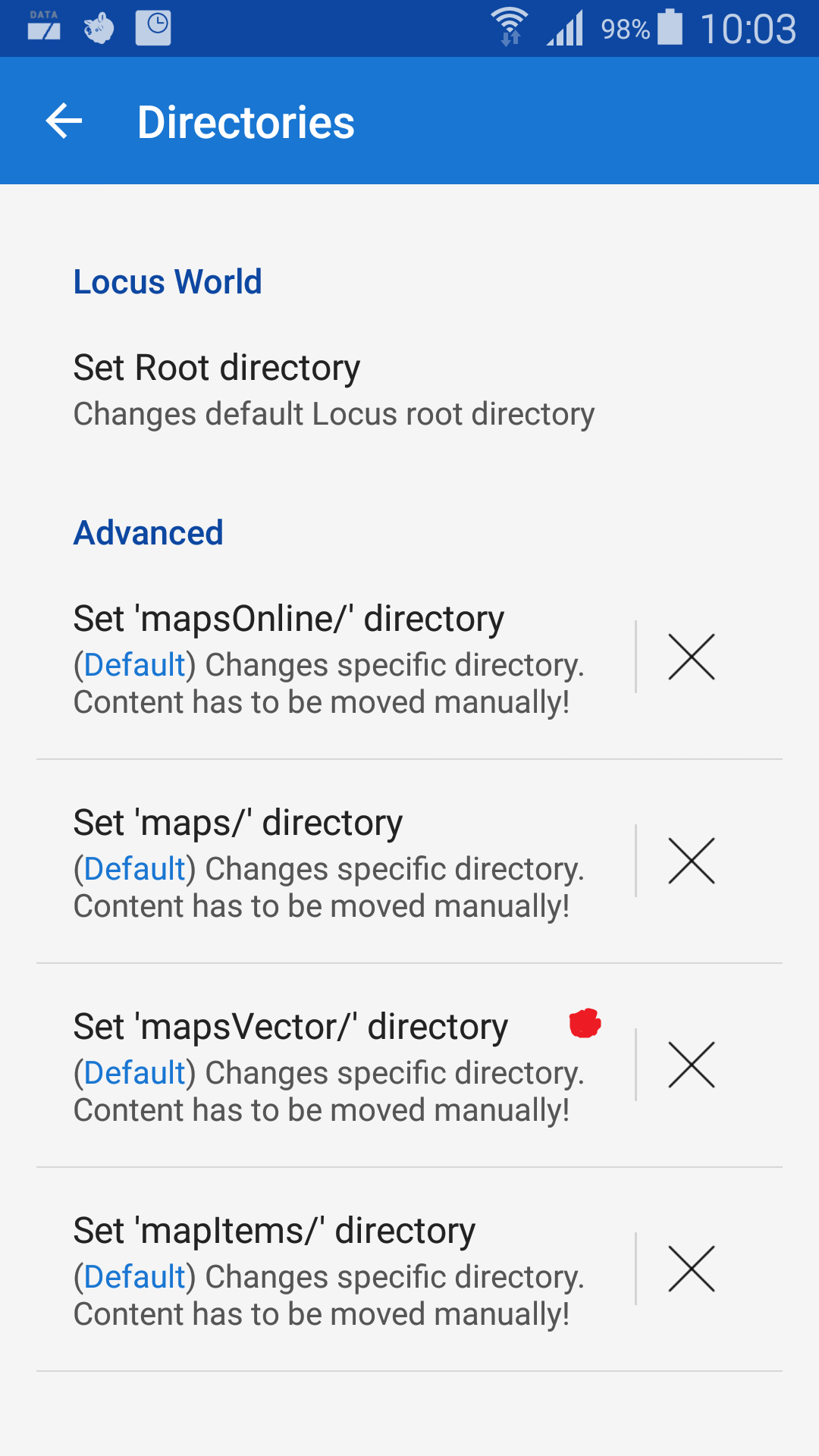Sure, here's it. I followed the settings path in the release info, then I went to the SD card where I have my folder with maps that didn't fit in the internal memory and that I was using with the old workaround. I then closed the app, waited 10 seconds, went to a file manager and moved all the content from the internal folder to the SD one, started the app again and then it did what I said - didn't recognise the maps in Locus store (I can see them and use them, but not update them) and downloaded a new one back to the internal memory.