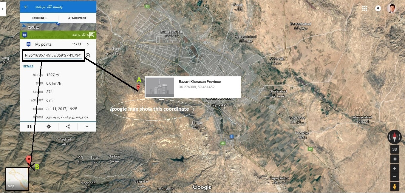 honestly, I don't understand what's the trouble - I simulated your issue and the coordinates are the same on Google and Locus and the point position near Mashhad as well. See attachments.